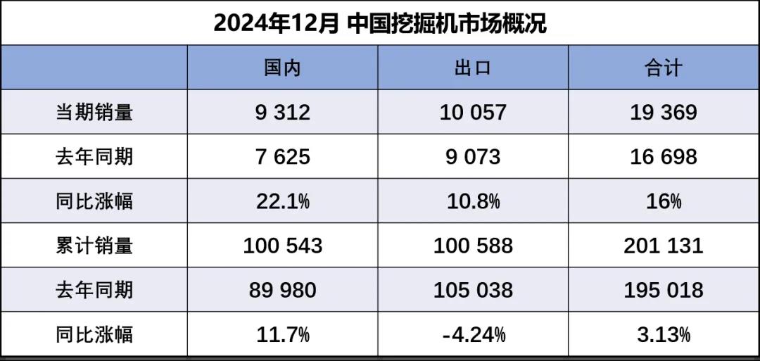 據中國工程機械工業協會對挖掘機主要制造企業統計,2024年12月銷售各類挖掘機19369臺,同比增長16%。其中國內銷量9312臺,同比增長22.1%;出口量10057臺,同比增長10.8%。2024年,共銷售挖掘機201131臺,同比增長3.13%;其中國內銷量10054…......
